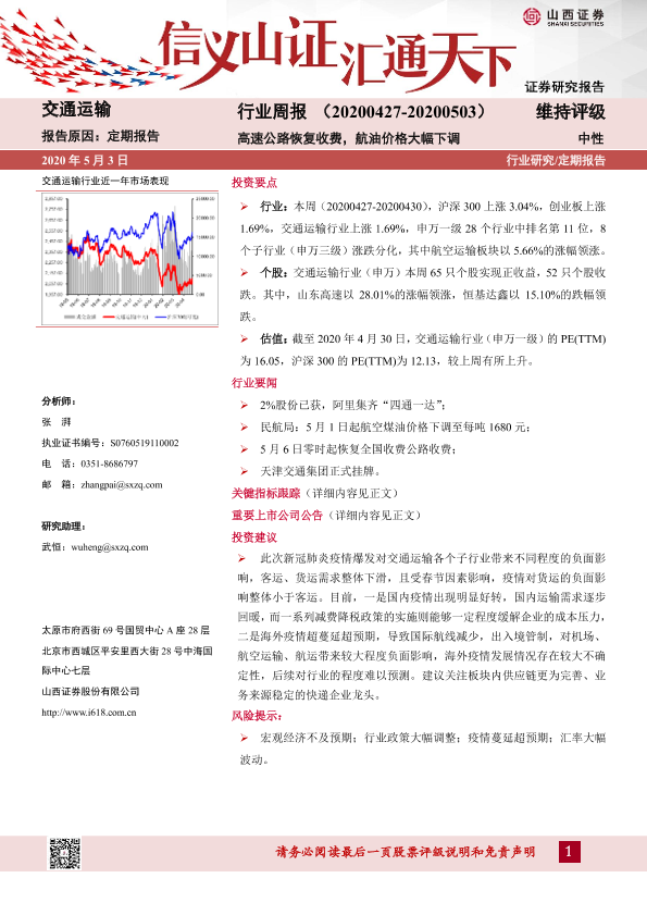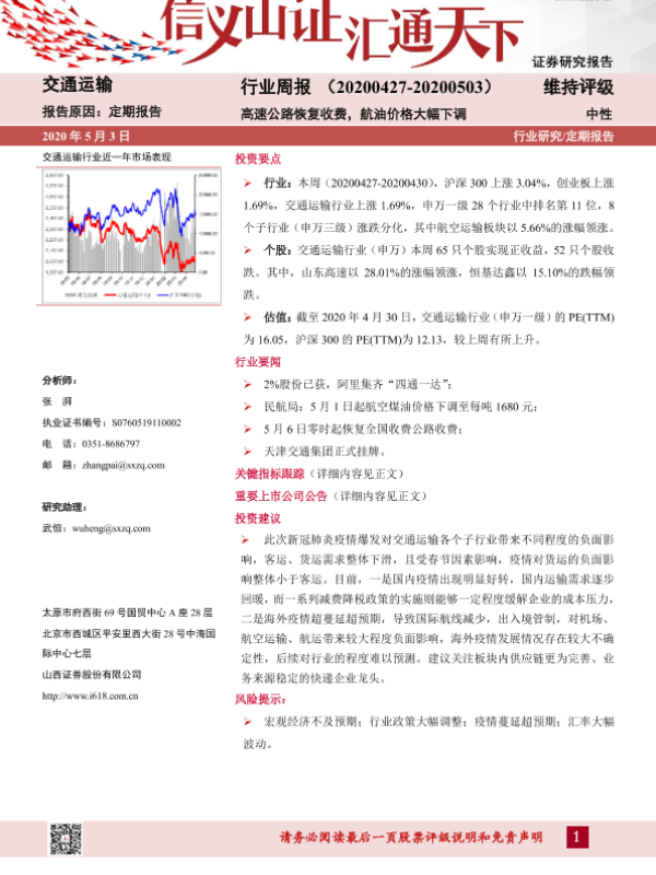 【山西证券】【20200503】交通运输行业周报:高速公路恢复收费,航油价格大幅下调-16页