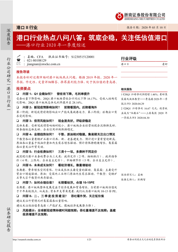 【浙商证券】【20200510】港口行业2020年一季度综述:港口行业热点八问八答:筑底企稳,关注低估值港口-23页