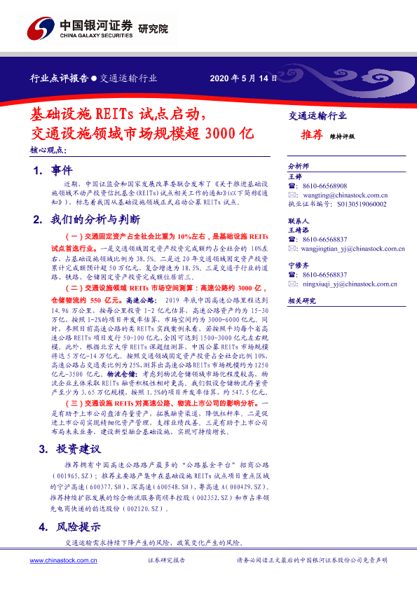 【银河证券】【20200514】交通运输行业点评报告:基础设施REITs试点启动,交通设施领域市场规模超3000亿-13页