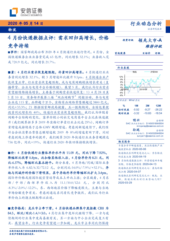 【安信证券】【20200514】4月份快递数据点评:需求回归高增长,价格竞争持续-10页