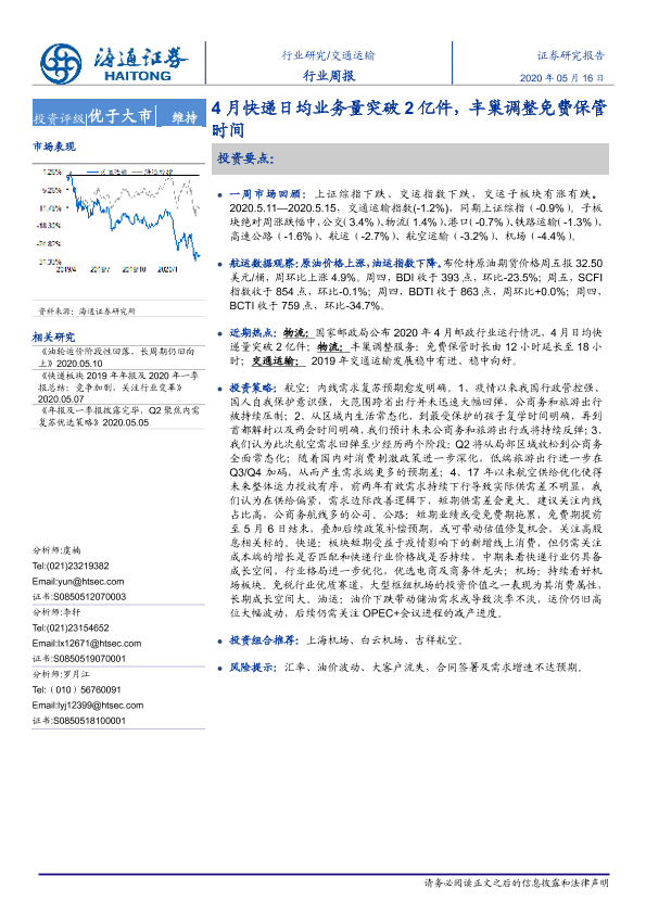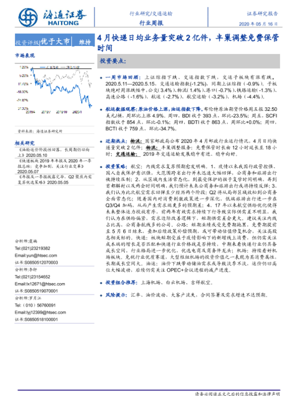 【海通证券】【20200516】4月快递日均业务量突破2亿件,丰巢调整免费保管时间-10页