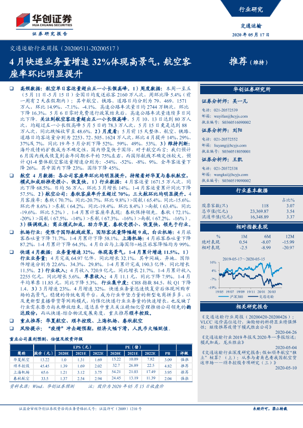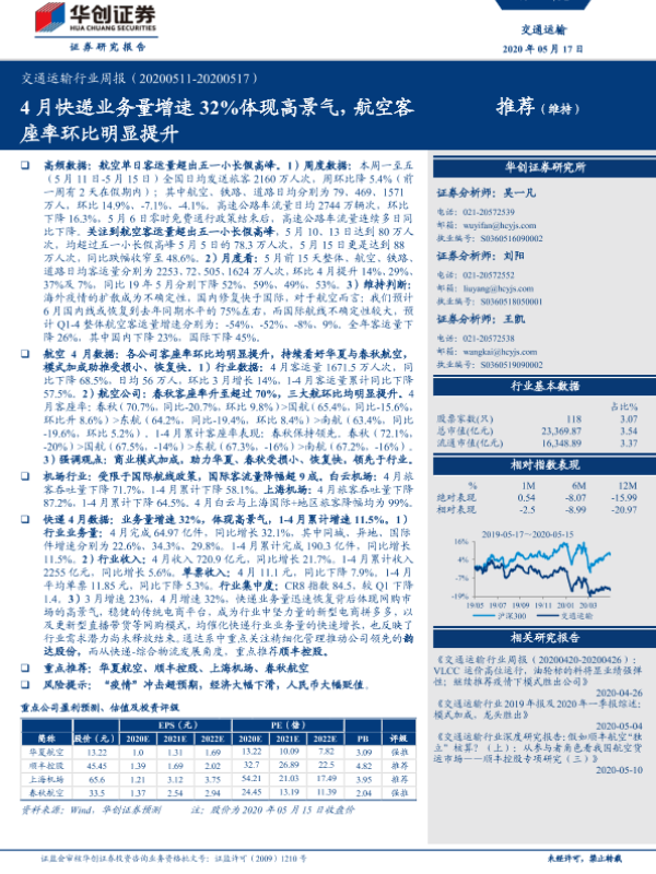 【华创证券】【20200517】4月快递业务量增速32%体现高景气,航空客座率环比明显提升-16页