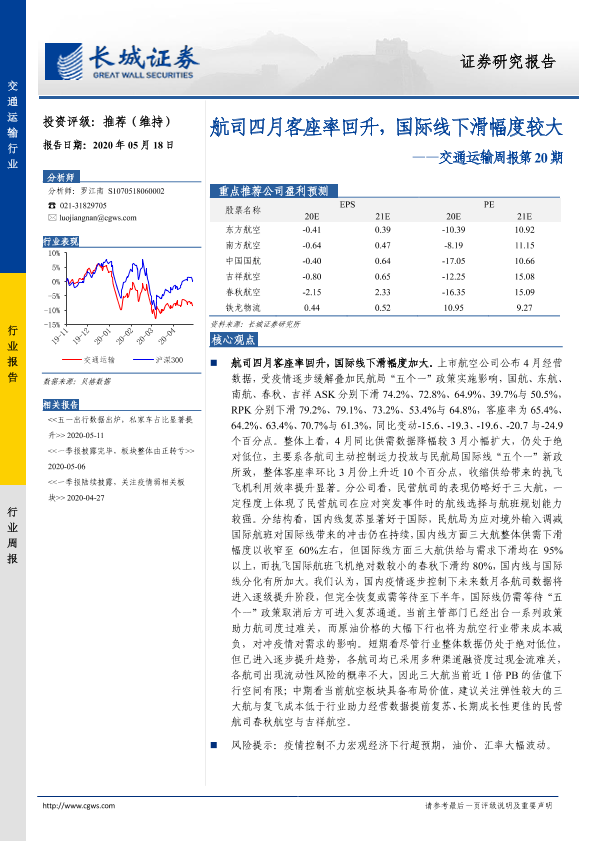 【长城证券】【20200518】航司四月客座率回升,国际线下滑幅度较大-21页