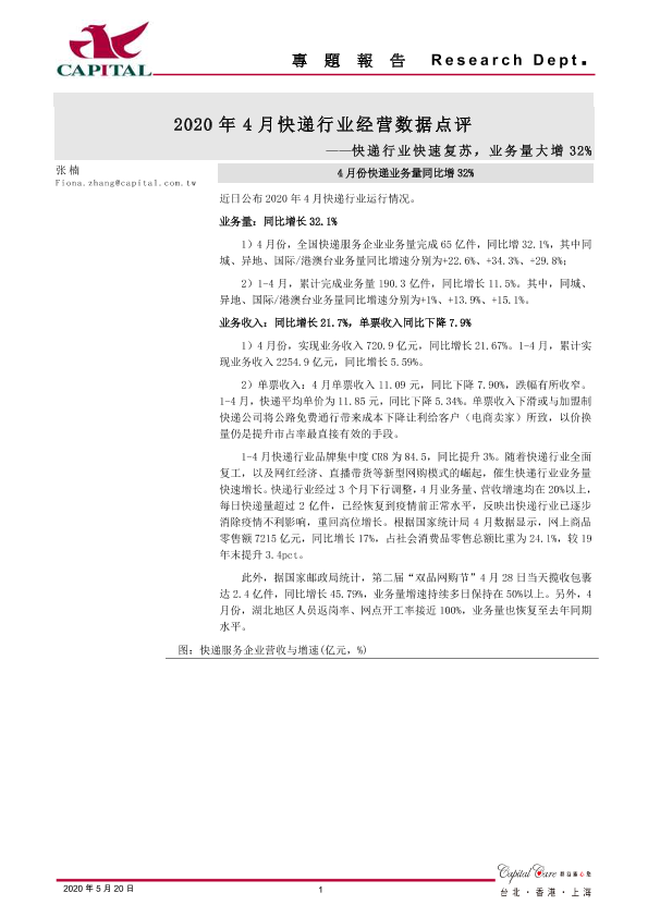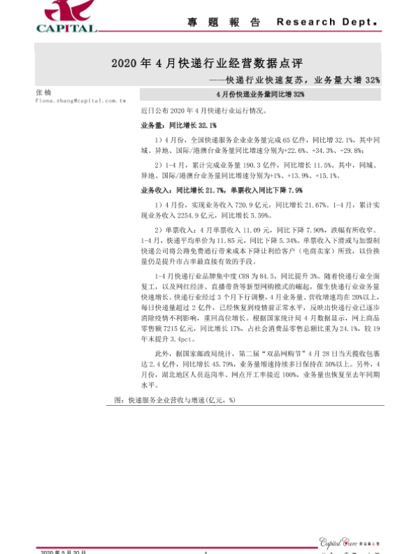 【群益证券】【20200520】2020年4月快递行业经营数据点评:快递行业快速复苏,业务量大增32%-7页