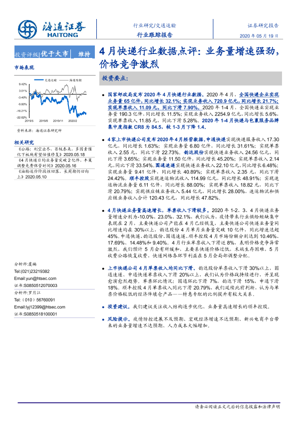 【海通证券】【20200519】4月快递行业数据点评:业务量增速强劲,价格竞争激烈-4页