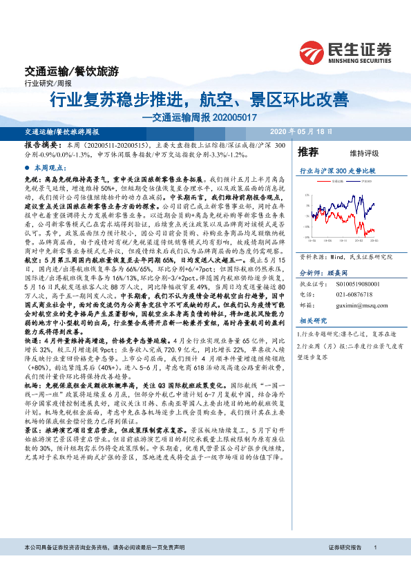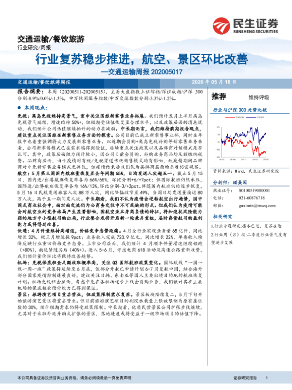 【民生证券】【20200518】行业复苏稳步推进,航空、景区环比改善-13页