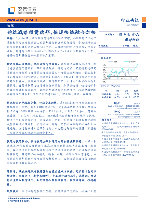 【安信证券】【20200524】韵达战略投资德邦,快递快运融合加快-4页