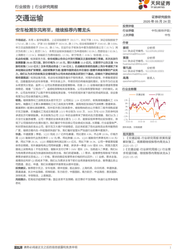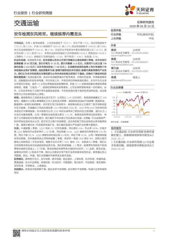 【天风证券】【20200524】交通运输行业研究周报:安车检测东风将至,继续推荐内需龙头-13页