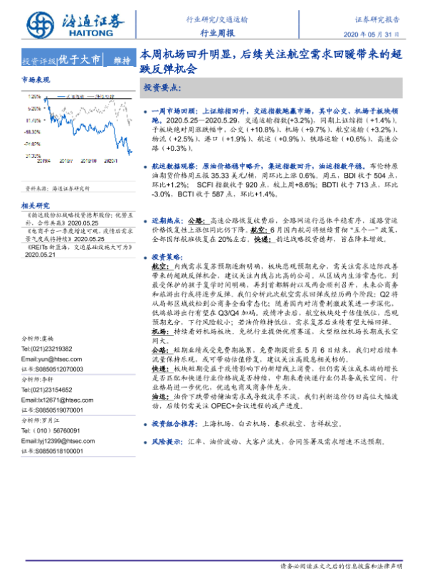 【海通证券】【20200531】交通运输行业周报:本周机场回升明显,后续关注航空需求回暖带来的超跌反弹机会-9页