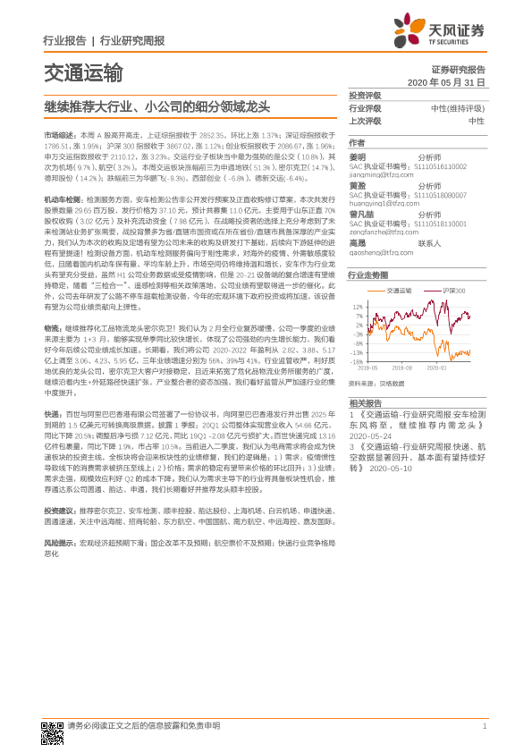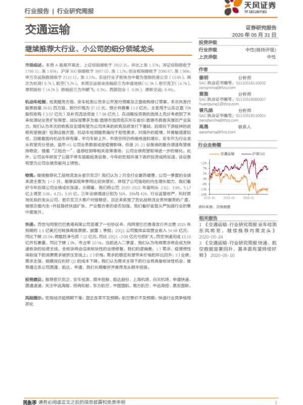 【天风证券】【20200531】交通运输行业研究周报:继续推荐大行业、小公司的细分领域龙头-13页