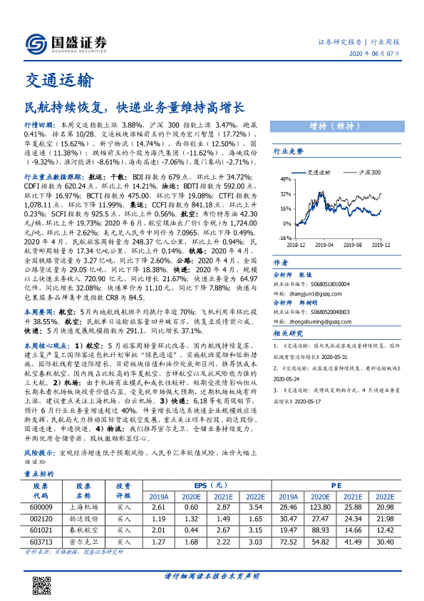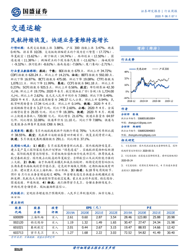 交通运输 快递增长 民航恢复 行业周报 证券研究