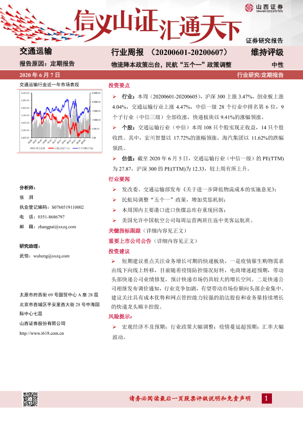 【山西证券】【20200607】交通运输行业周报:物流降本政策出台,民航“五个一”政策调整-15页