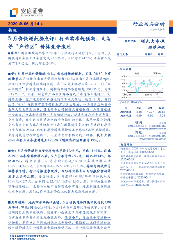 【安信证券】【20200614】5月份快递数据点评:行业需求超预期,义乌等“产粮区”价格竞争激烈-10页