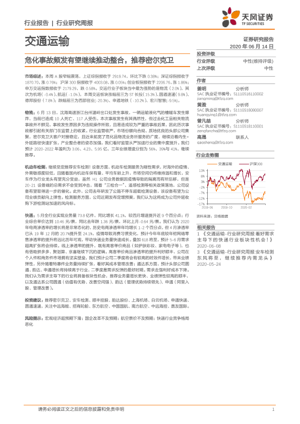 【天风证券】【20200614】交通运输行业研究周报:危化事故频发有望继续推动整合,推荐密尔克卫-15页