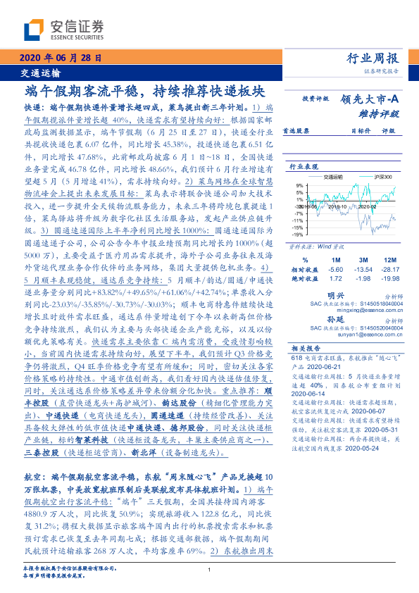 【安信证券】【20200628】交通运输行业周报:端午假期客流平稳,持续推荐快递板块-20页