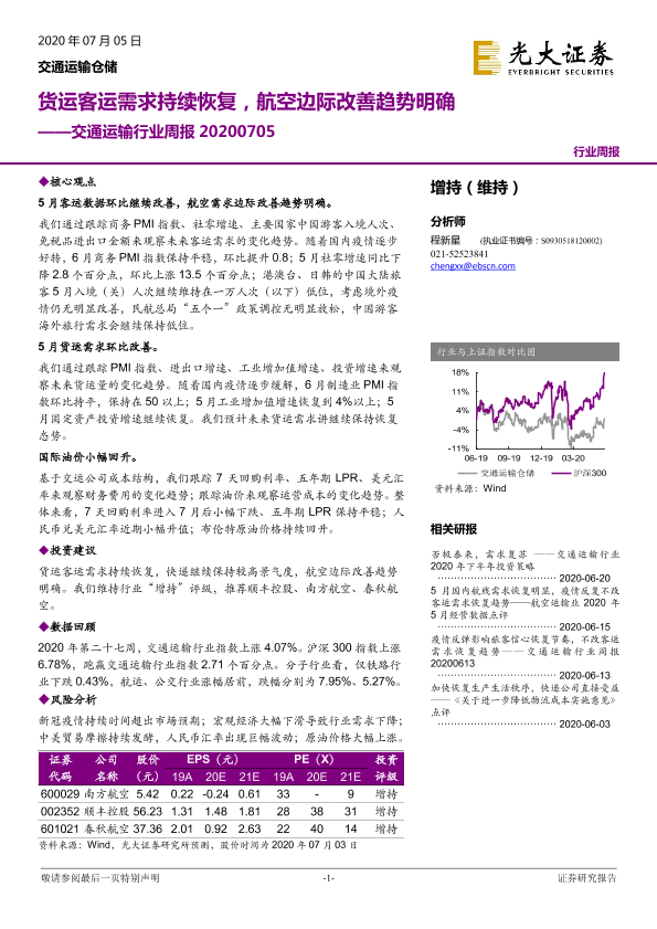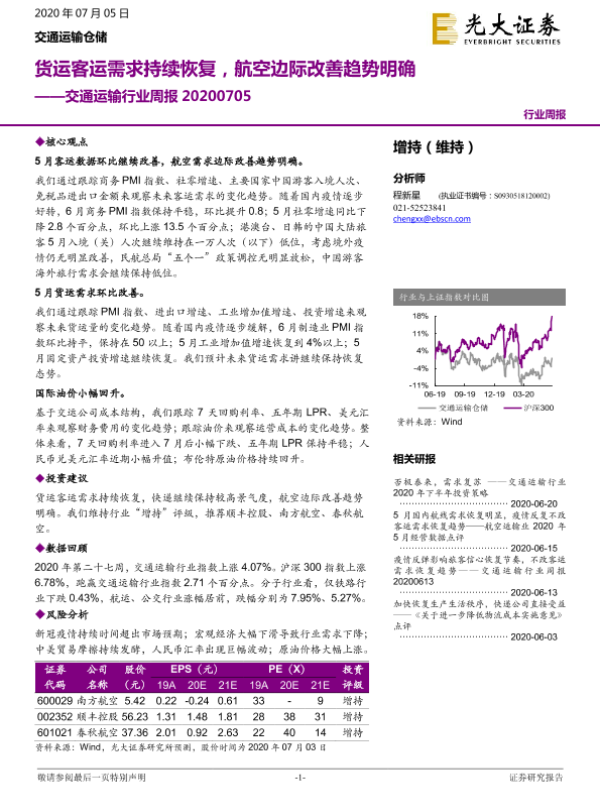 【光大证券】【20200705】交通运输行业周报:货运客运需求持续恢复,航空边际改善趋势明确-8页