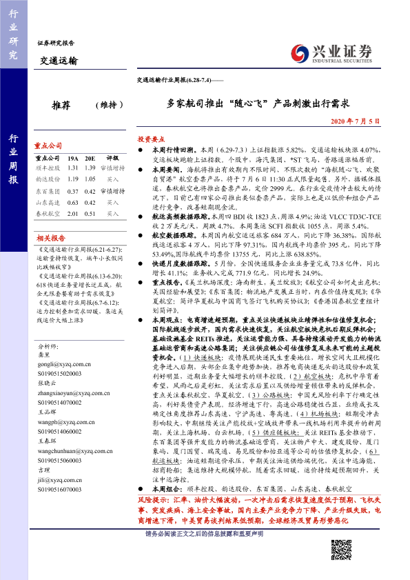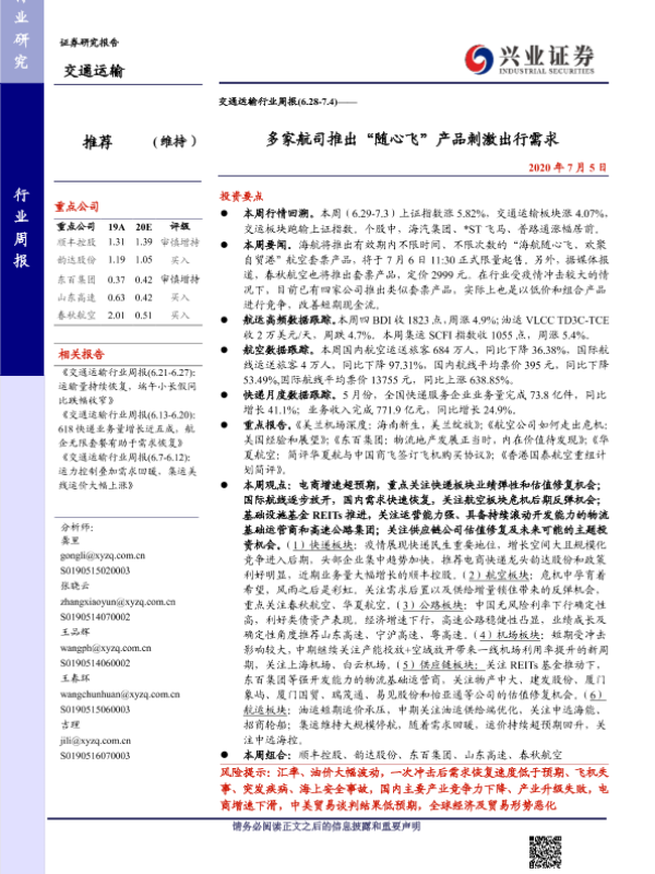 【兴业证券】【20200705】交通运输行业周报:多家航司推出“随心飞”产品刺激出行需求-20页