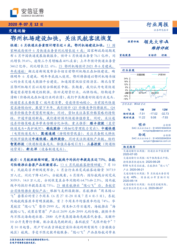 【安信证券】【20200712】交通运输行业周报:鄂州机场建设加快,关注民航客流恢复-19页