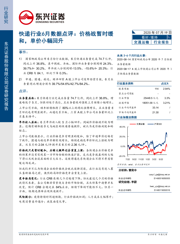 【东兴证券】【20200719】快递行业6月数据点评:价格战暂时缓和,单价小幅回升-9页