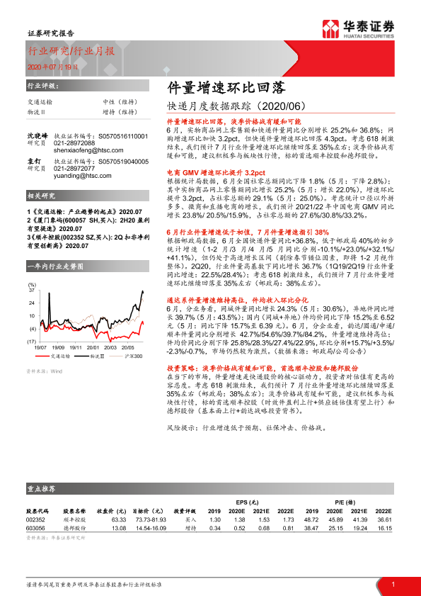 【华泰证券】【20200719】快递月度数据跟踪:件量增速环比回落-6页