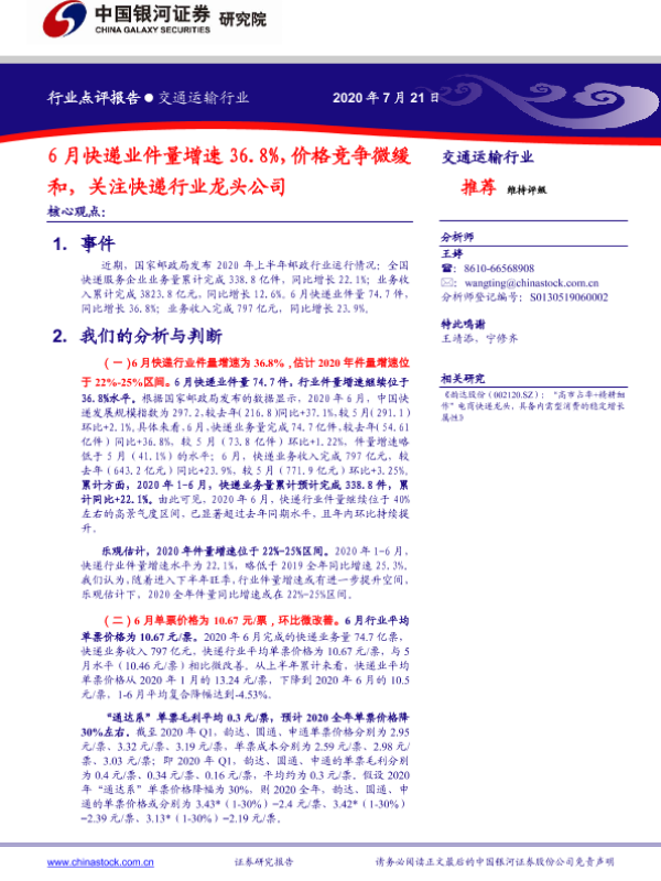【银河证券】【20200721】6月快递业件量增速36.8%,价格竞争微缓和,关注快递行业龙头公司-7页