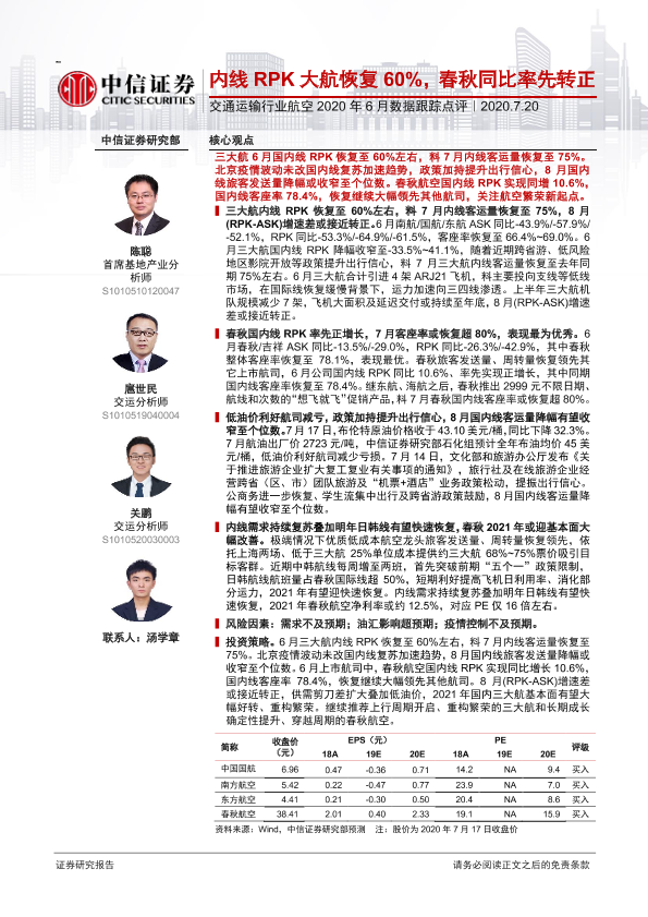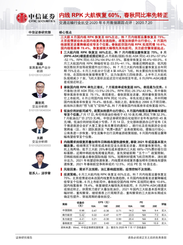 【中信证券】【20200720】交通运输行业航空2020年6月数据跟踪点评-10页