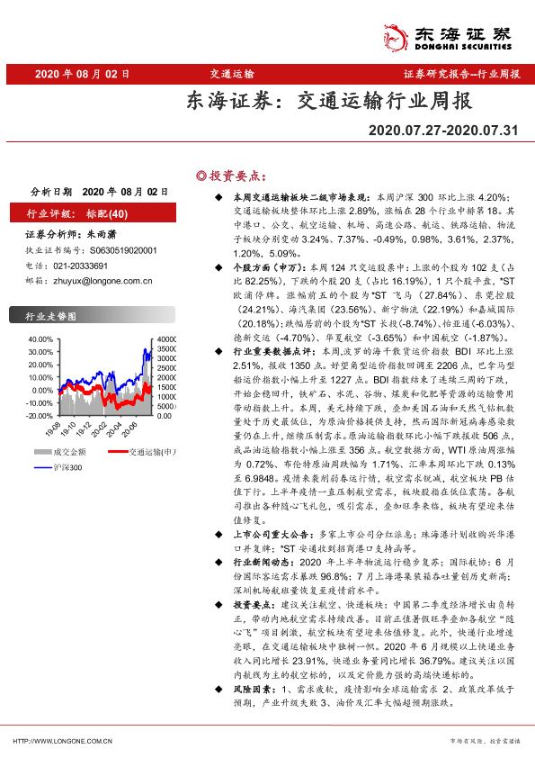 交通运输 市场表现 航空快递 行业周报 证券研究