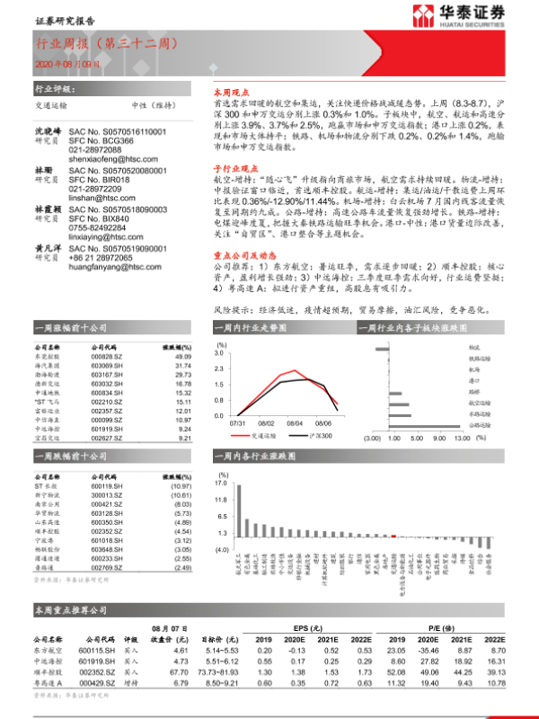 【华泰证券】【20200809】交通运输行业周报(第三十二周)-10页