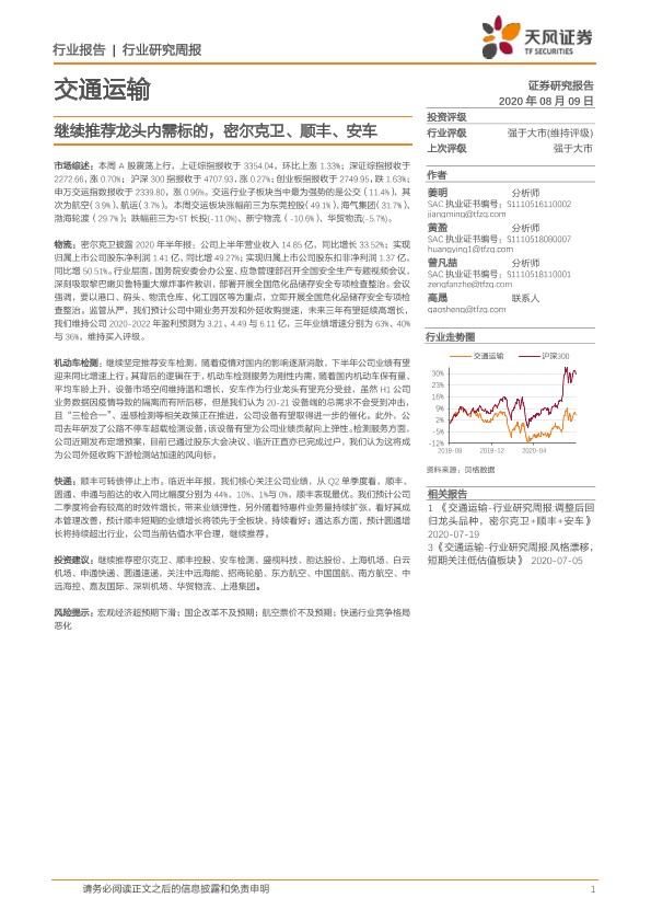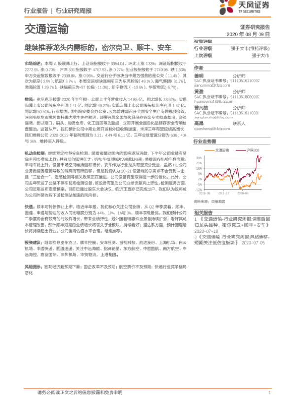 【天风证券】【20200809】交通运输行业研究周报:继续推荐龙头内需标的,密尔克卫、顺丰、安车-16页