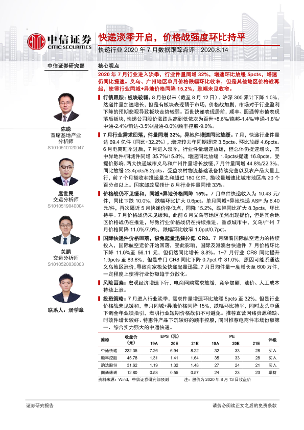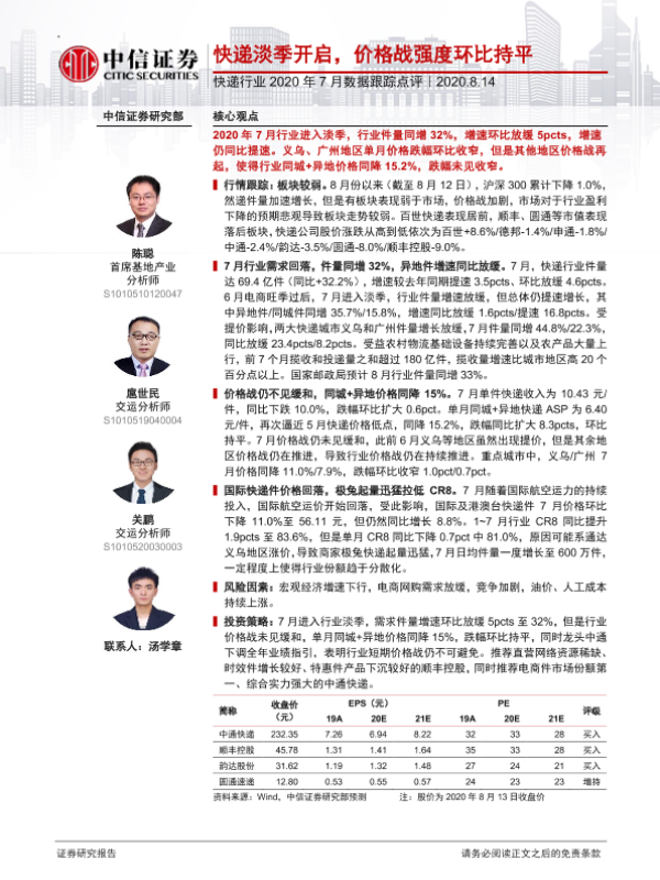 【中信证券】【20200814】快递行业2020年7月数据跟踪点评-10页