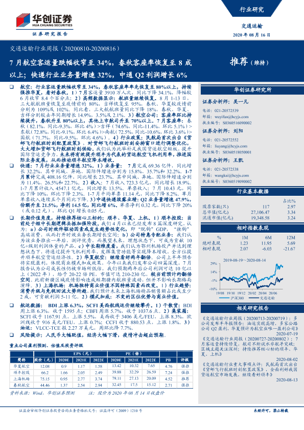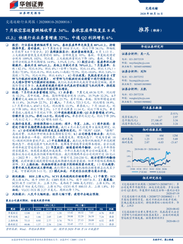 【华创证券】【20200816】交通运输行业周报:7月航空客运量跌幅收窄至34%,春秋客座率恢复至8成以上;快递行业业务量增速32%,中通Q2利润增长6%-17页