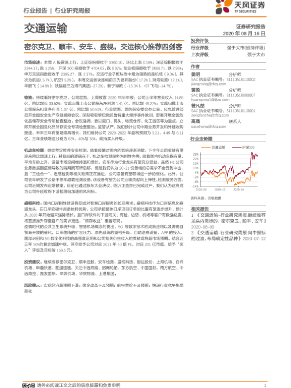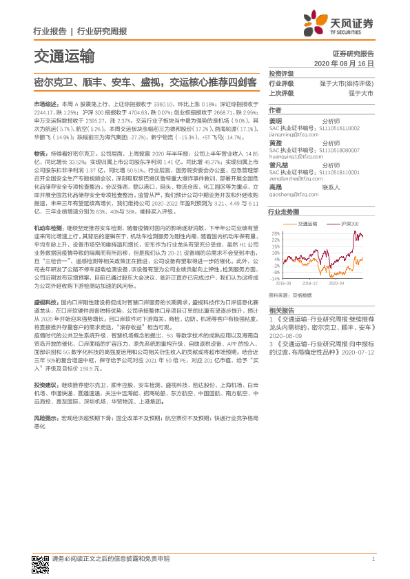 【天风证券】【20200816】交通运输行业研究周报:密尔克卫、顺丰、安车、盛视,交运核心推荐四剑客-14页