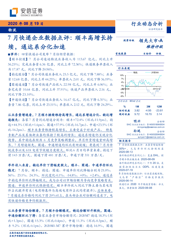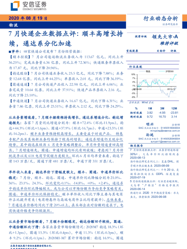 【安信证券】【20200819】7月快递企业数据点评:顺丰高增长持续,通达系分化加速-4页