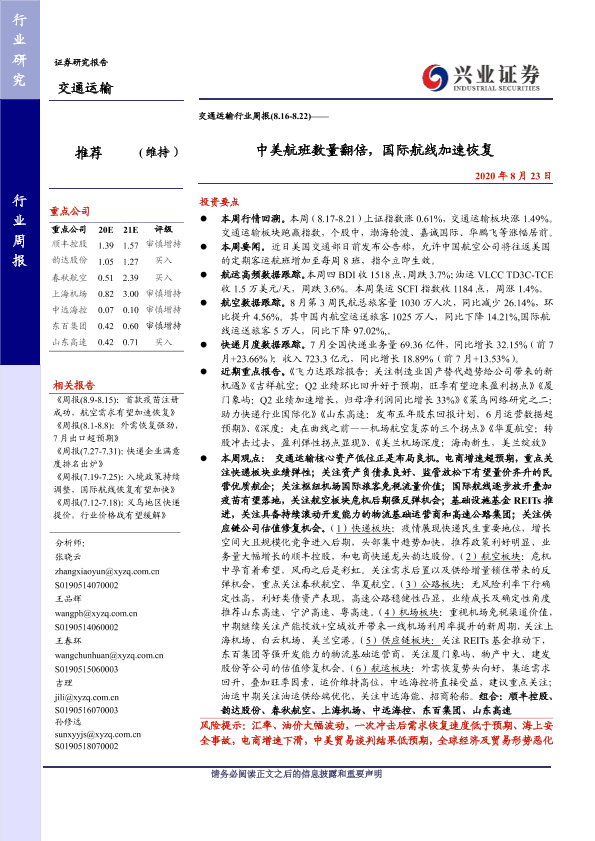 【兴业证券】【20200823】交通运输行业周报:中美航班数量翻倍,国际航线加速恢复-22页