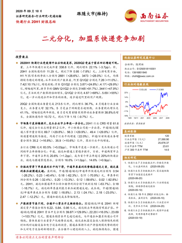 【西南证券】【20200910】快递行业20H1财报总结-16页