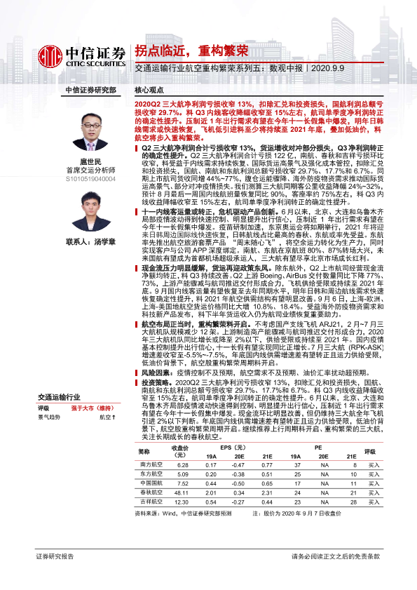 【中信证券】【20200909】交通运输行业航空重构繁荣系列五:数观中报:拐点临近,重构繁荣-20页