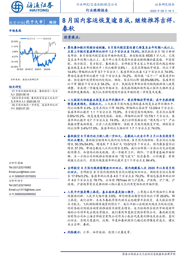 【海通证券】【20200916】8月国内客运恢复逾8成,继续推荐吉祥、春秋-4页