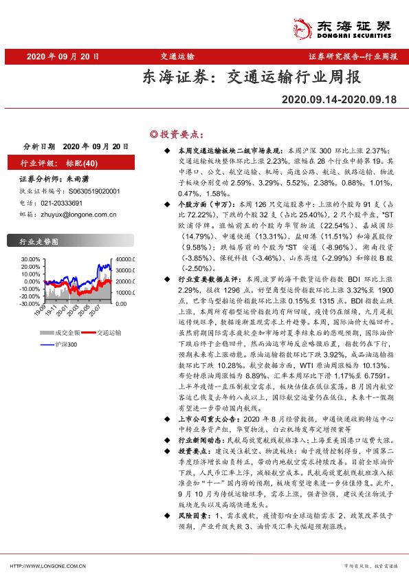 交通运输 市场表现 投资建议 行业周报 证券分析