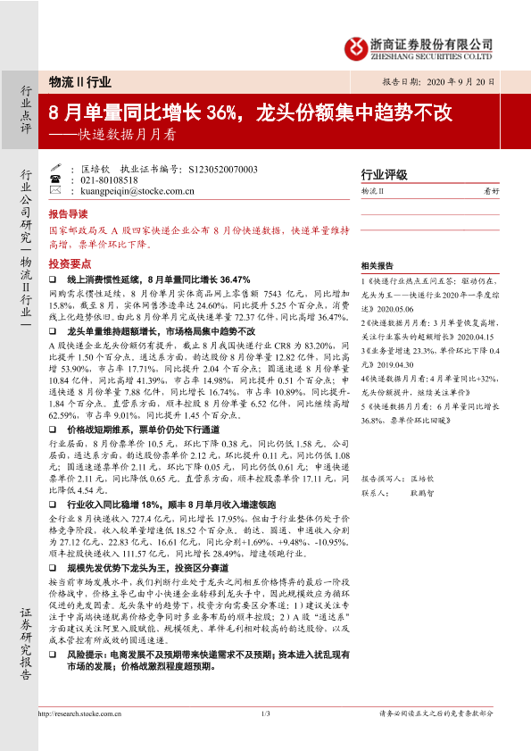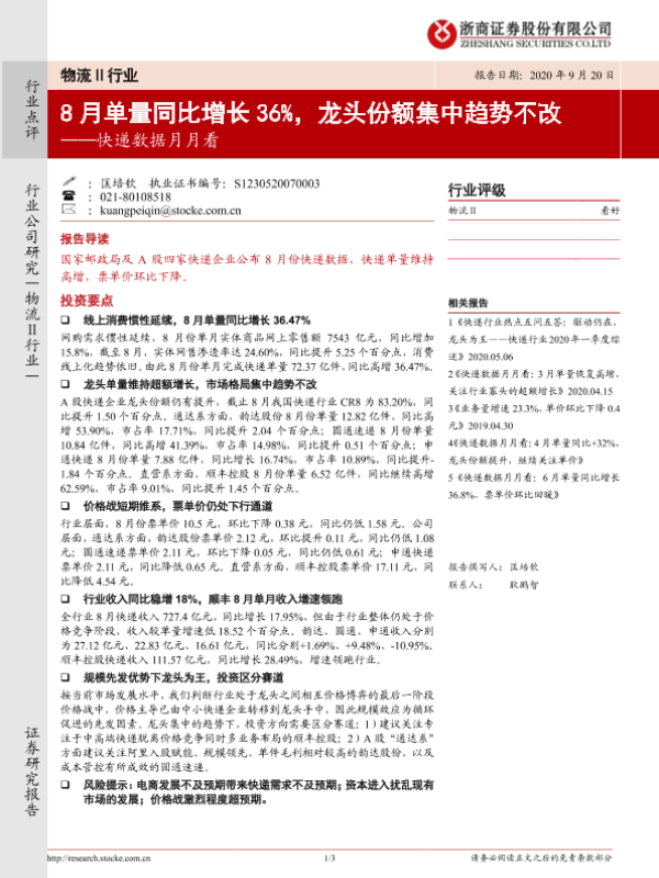 【浙商证券】【20200920】8月单量同比增长36%,龙头份额集中趋势不改-3页