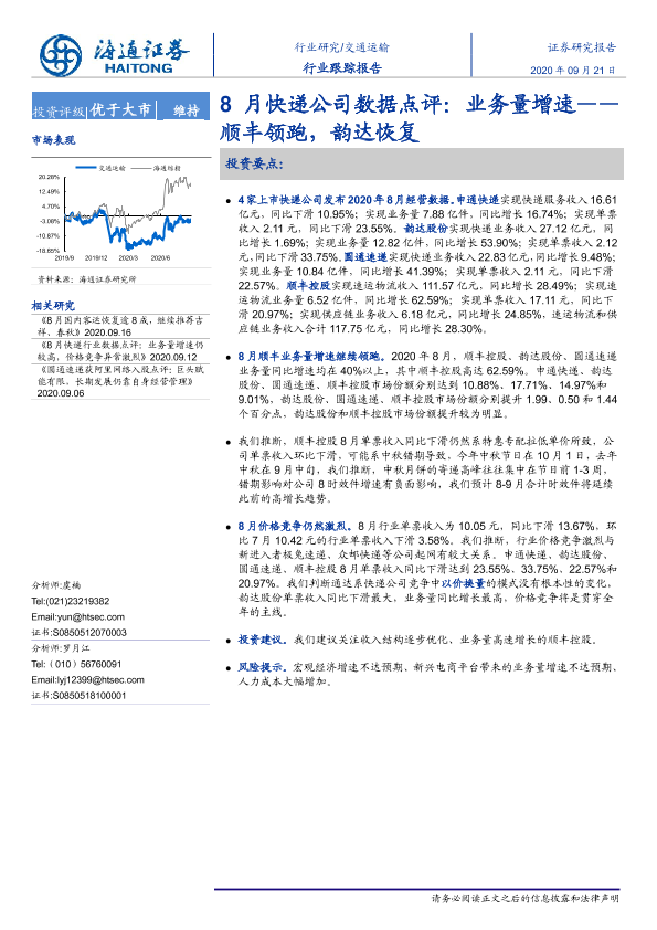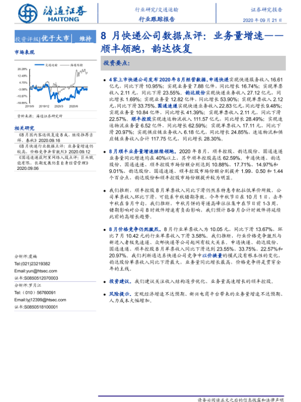 【海通证券】【20200921】8月快递公司数据点评:业务量增速——顺丰领跑,韵达恢复-4页