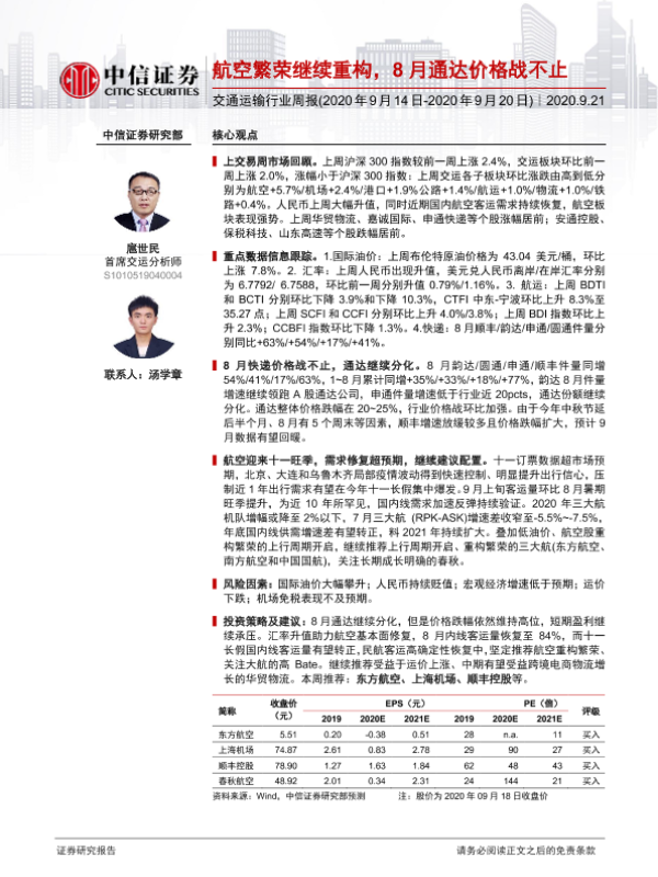 【中信证券】【20200921】交通运输行业周报:航空繁荣继续重构,8月通达价格战不止-22页