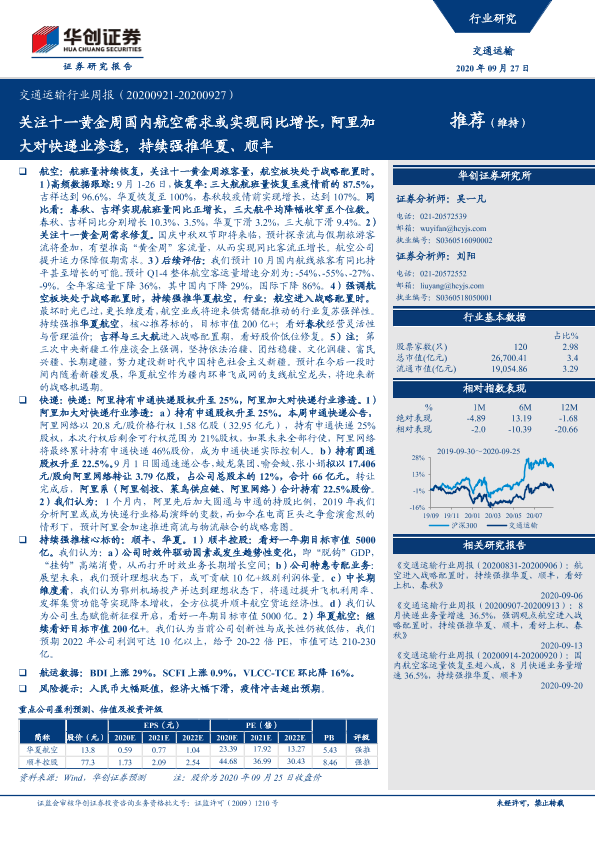 【华创证券】【20200927】交通运输行业周报:关注十一黄金周国内航空需求或实现同比增长,阿里加大对快递业渗透-18页