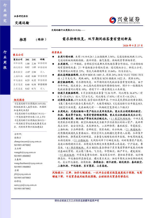 【兴业证券】【20200927】交通运输行业周报:需求持续恢复,双节期间旅客量有望创新高-18页