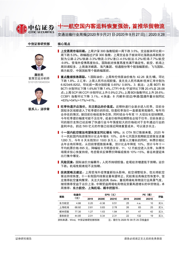 【中信证券】【20200928】十一航空国内客运料恢复强劲,首推华贸物流-23页