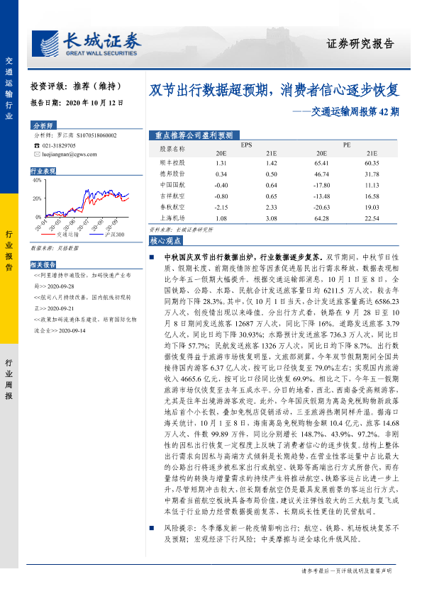 【长城证券】【20201012】双节出行数据超预期,消费者信心逐步恢复-18页