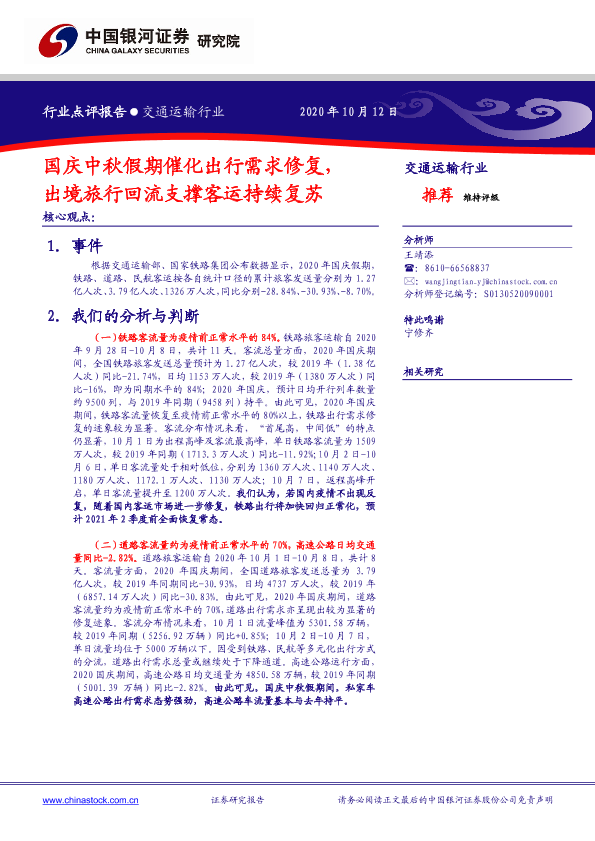 【银河证券】【20201012】交通运输行业:国庆中秋假期催化出行需求修复,出境旅行回流支撑客运持续复苏-6页