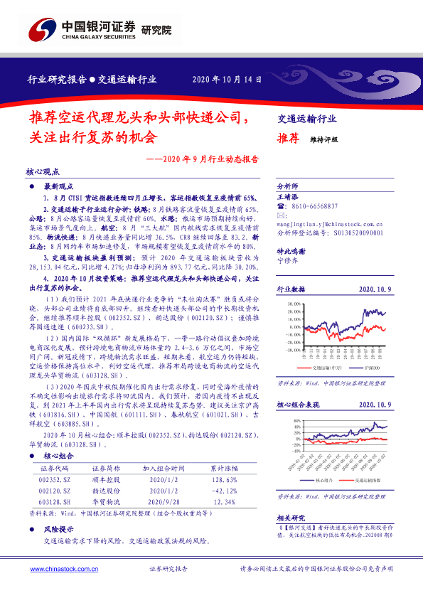 【银河证券】【20201014】交通运输行业2020年9月行业动态报告:推荐空运代理龙头和头部快递公司,关注出行复苏的机会-44页