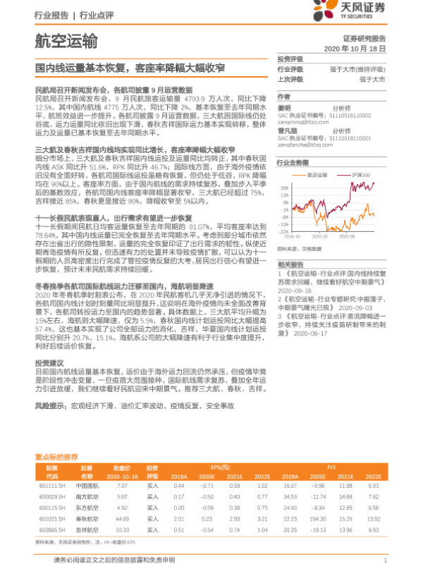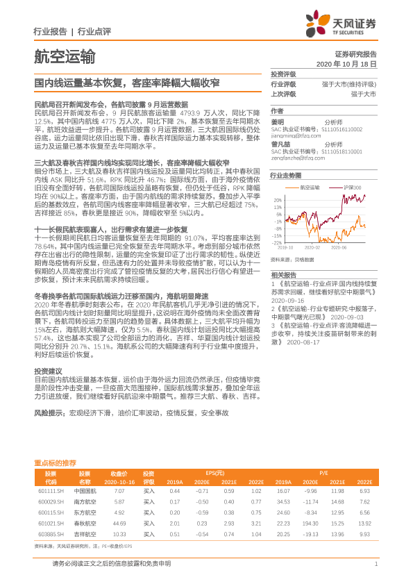 【天风证券】【20201018】航空运输行业点评:国内线运量基本恢复,客座率降幅大幅收窄-6页