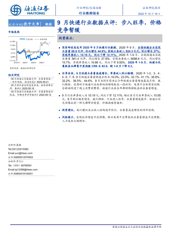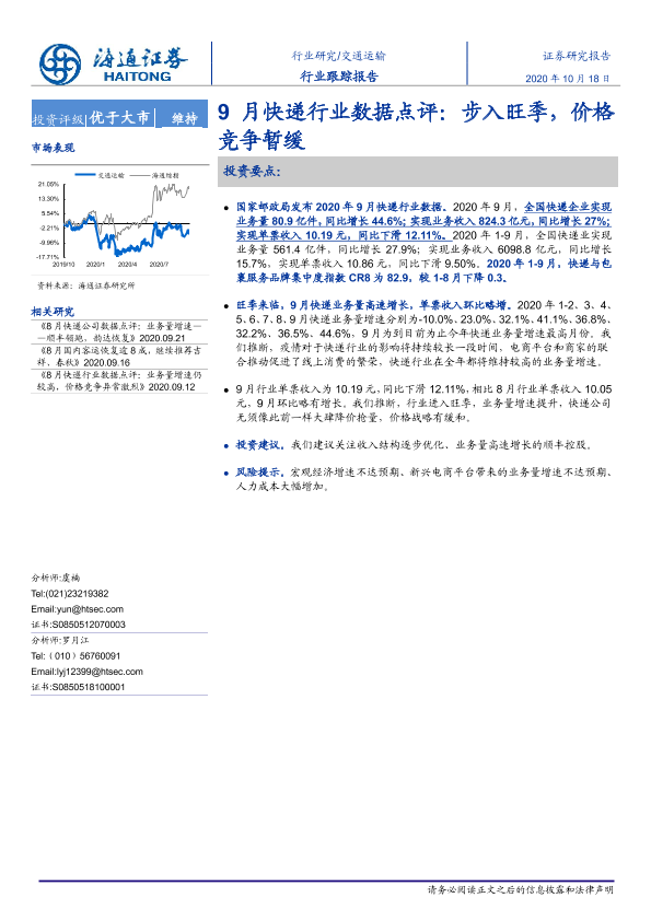 【海通证券】【20201018】9月快递行业数据点评:步入旺季,价格竞争暂缓-7页
