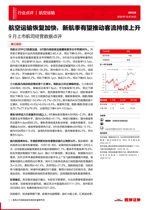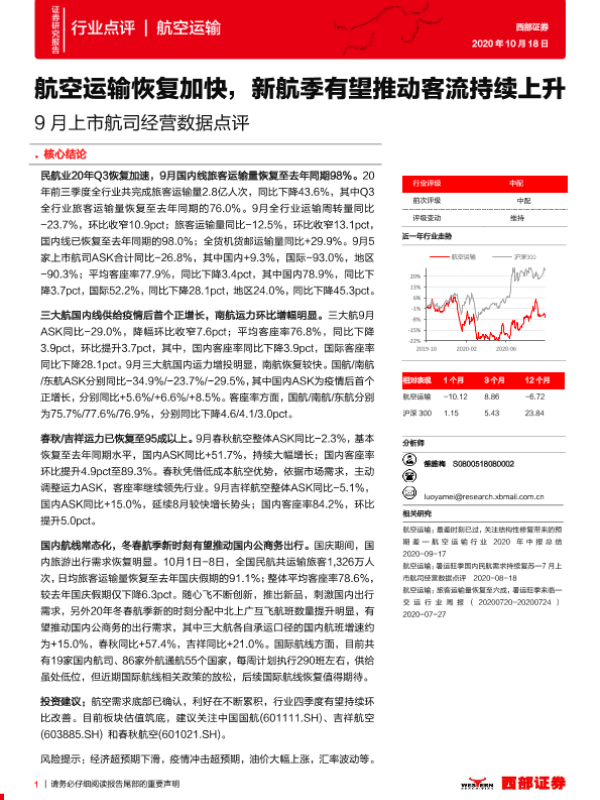 【西部证券】【20201018】9月上市航司经营数据点评:航空运输恢复加快,新航季有望推动客流持续上升-4页